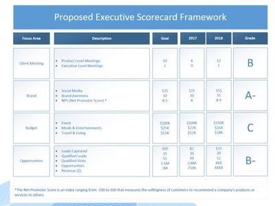 As an executive, you have goals and strategies you want to be met and followed. Measuring the performance of these goals and strategies can be achieved using an executive scorecard. First, split your goals into different areas of focus such as improving your company’s brand, tracking how well the company uses its budget, or how it uses opportunities.